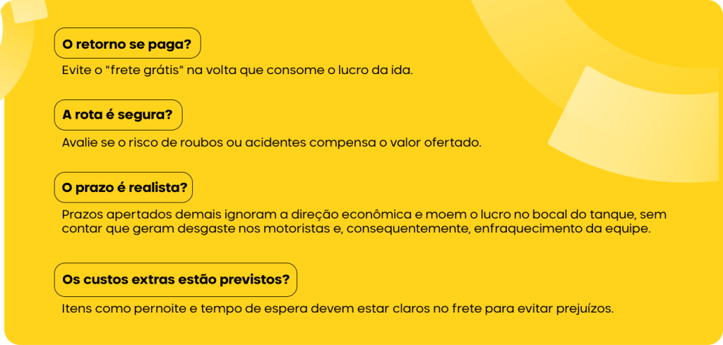 Traduzindo para o contexto desse artigo, ter milhares de contratos fechados não vai adiantar muita coisa se, na hora de fazer o fechamento do caixa, eles estiverem dando mais gastos do que lucro real. No fim, quantidade e qualidade são coisas diferentes, não é mesmo? Visto isso, saber recusar uma carga/contrato, também é estratégia.